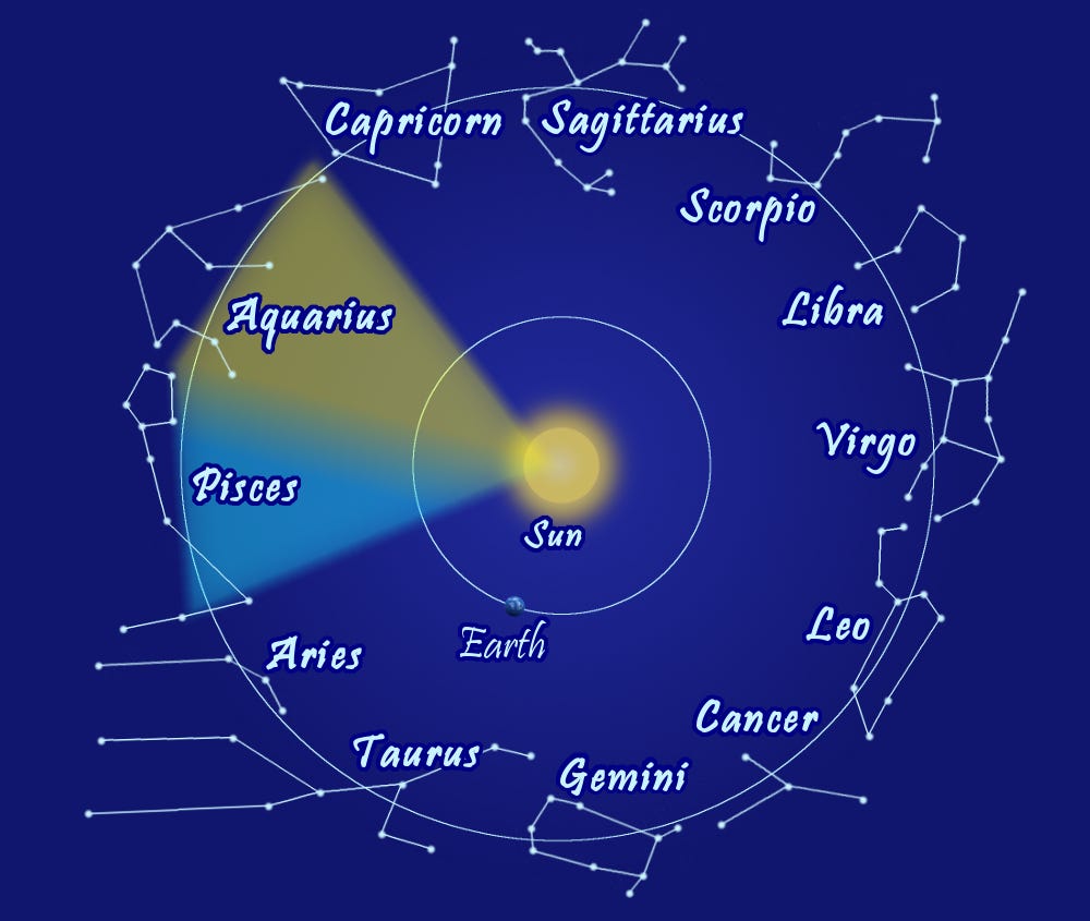 When Does the Age of Aquarius Begin? (and What It Means in Astrology) 1. Some astrologers say it will begin in 2597. The Age of Aquarius occurs when the sun's location shifts from Pisces to Aquarius. This happens during a change in the earth's rotation called precession. As the earth wobbles slowly in a new direction, the sun shifts from 1 constellation to another according to the zodiac.