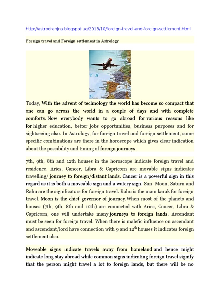 Foreign travel & Foreign settlement in astrology - ASTROLOGYLOVER One thing we must remember that there is a difference between Foreign travel and Foreign Settlement. For Foreign Travel relation between 3rd, 7th, Lagna, and 9th in a watery or Movable sign is sufficient but foreign settlement in astrology can not happen without the involvement of 12th house or 12th lord. Book Your Consultation !