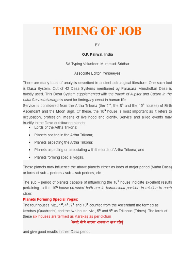 Timing of job in Vedic astrology - Vedic astrology Most of the astrologers tell you about the opportunities of getting a job . And opportunities vary from one country to other. Now below are the detailed analysis in timing of job in Vedic astrology Book your consultation here Timing of First Job 1st house 10th house 11th house 6th house Mahadasha and Antardasha (MD/AD)/ Transits