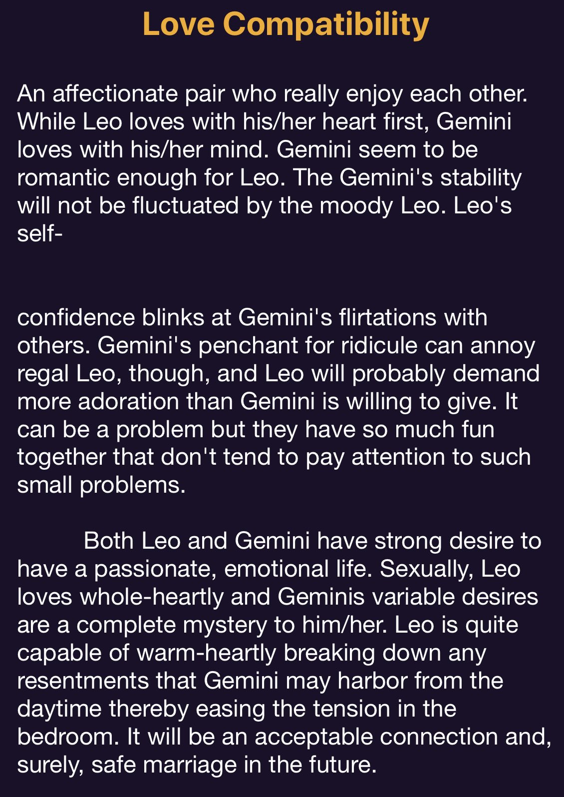 Gemini and Leo - Compatibility in Sex, Love and Life They are a very good fit when it comes to sex, for Gemini gives their relationship ideas and excitement, while Leo brings in energy, creativity and love. Their sex life can be stimulated by their intellect and communication, for they both rely on their conscious Self and their mind.