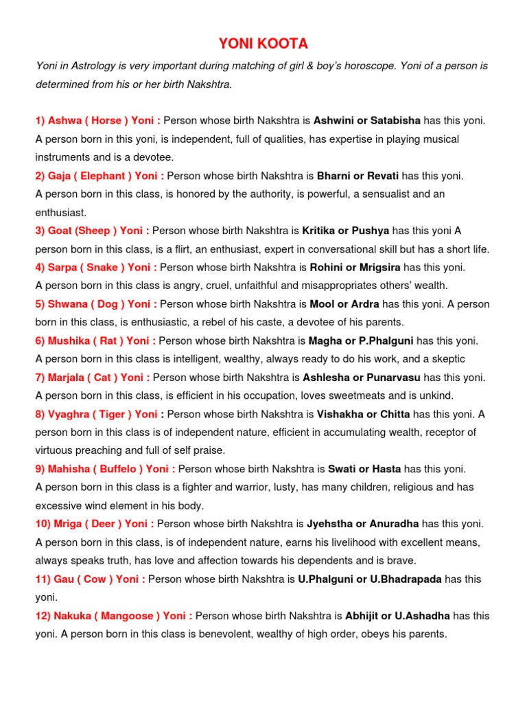 Snakes and the Nakshatra yoni animals - psychologically astrology Marjar yoni - Cat, but Marjar is also to clean up or erase something. Mahish yoni - Buffalo but Mahish means powerful, the Sun or someone having knowledge of the universes. Devi kills the Mahish-asur, ie she removes the limited knowledge of the manifested creation to grant you the knowledge of Reality. Importance Of Yoni Matching For Marriage In Kundali Yoni Milan is based on 14 animal characteristics and analyzed based on the Janma Nakshatra of a person. It helps to explain the affinity and biological compatibility of partners as per the behaviour and attitude of a person. Yoni matching is considered to be essential criteria before tying the knot with someone. Animals Of All 27 Nakshatras And What It Represents - Part 1 Cat Male Cats the animal of Punarvasu Nakshatra can really sleep for long hours yet have high sexual activity. This indicates a passive and procreating ability. Ashlesha symbolizes the female cats who are very observant and sensual. Serpent The male serpent, the animal of Rohini is known to be very silent and dormant.