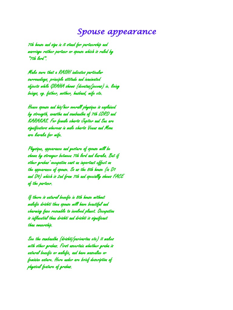 Looks of spouse astrology. astrofix.net › libra-houses-in-astrologyLibra Through the Houses in Astrology – ASTROFIX Fashion writers. Fashion and beauty bloggers. Keeping a daily fashion journal. Chictopia.com. Beautiful handwriting. Calligraphers. Writing beautiful love letters. A sweet voice. Superficial conversations. A person who gives abundant compliments about a person’s looks or clothes. Endless talk about the spouse, girlfriend or boyfriend. cafeastrology.com › articles › vertexsignshousesVertex in the Signs and in Aspect | Cafe Astrology .com You need people with good communicative skills in your life who will stimulate you mentally. A sibling or spouse may fulfill this role. Since you take a mental view of life, education is important. Pets and automobiles are often part of your life. Vertex Conjunct Venus. You are often expected to rely on your charm and good looks to advance in life. astrologylover.com › future-spouse-appearance-fromFuture Spouse Appearance-Beautiful Wife or Husband from 7th ... Apr 09, 2019 · Spouse Appearance from Astrology. We all want Beautiful wife or handsome husband. But all of us are not So lucky. There are certain Planetary combination which gives important clue about Appearance of spouse in astrology. So these combinations will indicate about the Look, Complexion, Height, Physical appearance of Your Future Spouse. vedicknowledge.in › marriage-prediction-spouseMarriage partner prediction from astrology – Vedicknowledge Oct 07, 2020 · Spouse physical appearance when 7th Lord is in the sign of Virgo- your would-be partner will be medium in height. He or she will be slight flabby but have dark eyes. The smile will make your spouse lovable and attractive. The placement will help your spouse to make itself fulfilled with vitality.