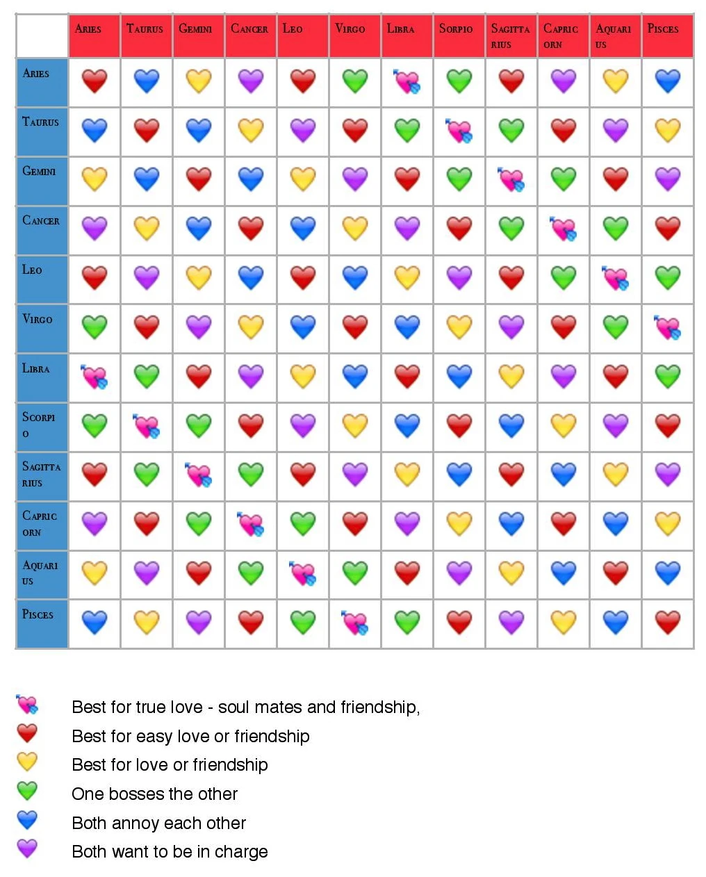 Zodiac Signs Compatibility Chart Percentages for Overall, … 15.05.2018 · In order to do this, we can examine the compatibility between the various zodiac signs. Zodiac Compatibility Chart. When looking at the zodiac compatibility chart, the most compatible zodiac signs are Pisces and Cancer … Love Astrology for True Compatibility between Zodiac Signs 13.09.2020 · These signs are known for a tight physical and emotional body as a unit. They understand and appreciate each other and share hot bonding. Moreover, they offer respect … Zodiac Compatibility | Love, Marriage, Relationship, Sex 30.06.2022 · Libra is most compatible with the other air signs: Gemini and Aquarius; and it matches well with Taurus, because they are both ruled by Venus. Read more about Libra love …