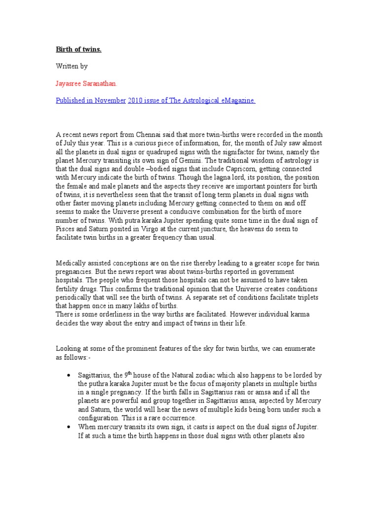 Birth of twins in vedic astrology. How do we predict about twins as per Vedic astrology? - Quora Following are some of the rules for birth of twins, If lord 5th house is well placed in Gemini and receives aspect from Mercury may give birth of twins If Sun & Jupiter occupies Gemini and aspected by Mercury then birth of male twins can be predicted. What Astrology has To say on Twin's Birth! 4) According to Prashara Hora Shastra birth of twins is indicated when the native, who has the sun in a quadruped sign while others are in dual signs with strength, is born as one of the twins. Quadruped signs are second part of Taurus, Leo. First half of Capricorn and second part of Sagittarius. Twins Birth Prediction Archives - Vedic Astrologer Kapoor Astrologer in Jangpura Delhi on twins and astrology:-If the following planetary positions are present at the time of conception, there is a possibility of twins. 1. Moon and Venus should be situated in even sign. 2. Mercury, Mars, and Jupiter are in contrasting signs. 3. Ascendant and Moon are situated in Samarashi and are viewed by malefic […] Vedic astrology Predictions for twins | Future Point Here are the three things which are considered in the case of Twins Astrology: 1. Planetary Positions Practically, there are very fewer chances that the positioning of planets would change in between those five minutes. So the planetary positions will remain the same and there won't be a difference in the birth chart. 2. Ascendant