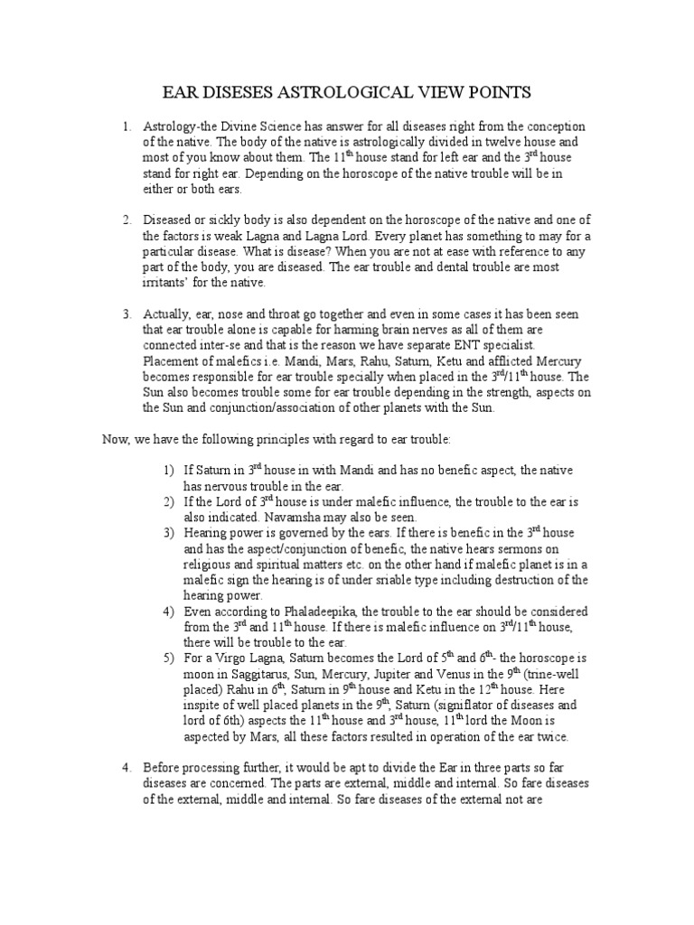Planets & Body Parts In Vedic Medical Astrology - Disease Related To ... Health Problems:Ketu is associated with sudden mysterious diseases and health ailments. It causes stomach disease, fever, intestine problems, ear problems, stomach pain and physical weakness. Yogas For Ear Problems in Vedic Astrology - Astrobix.com When Venus and Mercury are situated in the twelfth house of a horoscope, then the native has to suffer from the problems in the right ear. When a malefic planet is situated in the third, fifth, ninth and eleventh house without being aspected by any benefic planet, then the native suffers from ear related problems. Medical Astrology - How to predict diseases from a horoscope If you cast a careful look, it would be found that: 1.Moon (the karka of kidneys) is aspected by retrograde JUPITER which is the lord of 6th house of disease. 2. The 6th house (denoting kidneys) is occupied by a malefic planet SUN. 3. Ear Problems in Astrology - astrologer raman If a person is born at night with Venus in the fifth house and Mercury in the sixth house then also native gets problems related to ear. When Mercury and the lord of eighth house are together situated in the fourth house and Saturn is in the ascendant then the native gets problems in the internal area of the ear.