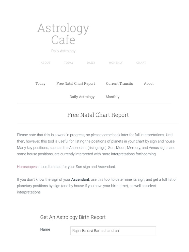 Natal Chart Report Your Personal Natal Chart. New! See the Astrology of NOW: Current planetary positions and aspects with interpretations. You can create a print-friendly or PDF copy of this report by clicking on the Print button below. You can delete unwanted or extraneous items (such as this sentence! - or parts of the report you don't want in your copy) simply ... Astrology Cafe - Daily Astrology Free Natal Chart Report. Recent. Astrology of Today - Monday, October 10, 2022; Astrology of Today - Sunday, October 9, 2022; ... Astrology Cafe offers daily astrology: Cafe Astrology horoscopes as well as current planetary positions and aspects influencing today, tomorrow, and the next day. ... Free Natal Chart Report Whole Signs Houses - Cafe Astrology See also Cafe Astrology’s Free Reports site, including full interpretations of the natal chart, transits, and compatibility, online since 2002. The interpretations in the birth chart report are written by myself, Annie Heese, and are typically expanded interpretations already found on this site. Reports: Astrology Profiles | Cafe Astrology .com Your Life Path is an insightful report that gets to the heart of the natal chart. This report offers a unique blending of the psychological, spiritual, and material plane potentials found in the birth chart. Your Life Path explores the signs, house positions, and aspects of the planets as well as the Ascendant and Midheaven.