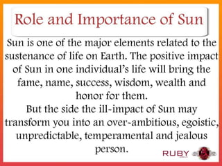 Remedies for Planet Sun, Malefic or Benefic Planet ... - Astroshastra Remedies for Planet Sun · 1. Wear Ruby Gemstone on Sunday one hour of the sunrise set in gold, copper or silver ring, touching the skin of the finger. · 2. Wear ...