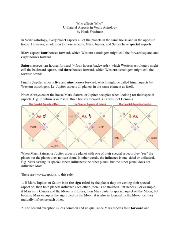 Planetary aspects in vedic astrology - Vedic astrology Planetary aspects plays an important role in vedic astrology. Every planet in vedic astrology has their aspects. Aspects are nothing but the houses that the planets can rules besides the house it is placed, Here we will discuss planetary aspects of each planet in vedic astrology. Aspect of Sun in vedic astrology. Aspect of moon in astrology. JUPITER AND VEDIC ASTROLOGY - SelfGrowth.com Planet Jupiter is well-thought-out the most benefice planet in Vedic astrology. It gives us wisdom, luck, respect, power, generosity, justice, intellectuality, philosophy ... Apart from the placement, Jupiter aspect 3 houses from where it is placed and the aspects of Jupiter is believed the most auspicious. Brahaspati has 5th, 7th and 9th ...