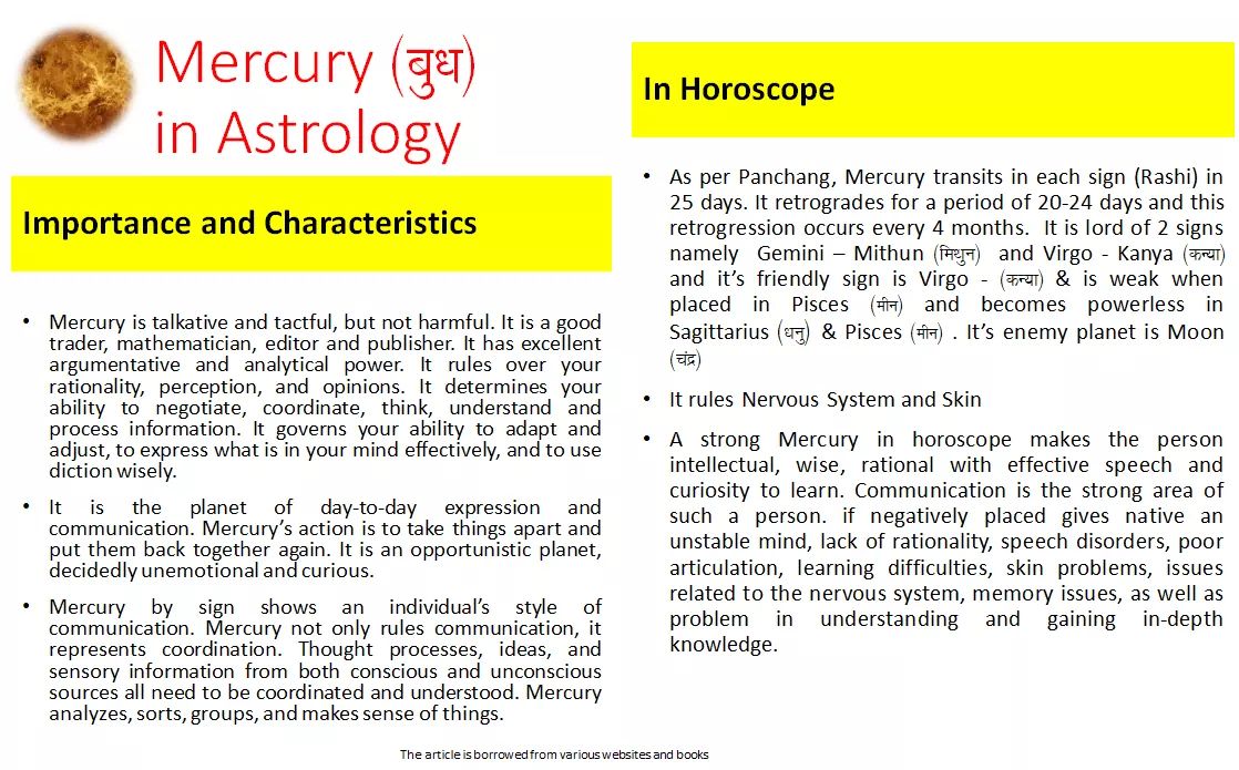 The Planet Mercury in Astrology - Characteristics, Personality Traits ... The Planet Mercury in Astrology : Characteristics, Personality Traits and Significations of Mercury Mercury is the heir apparent of the planetary cabinet. Mercury is witty and takes upon him the nature of the planet associated. He is RAJSIK, earthy and VAISHYA by caste.