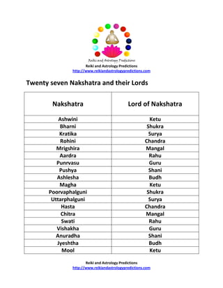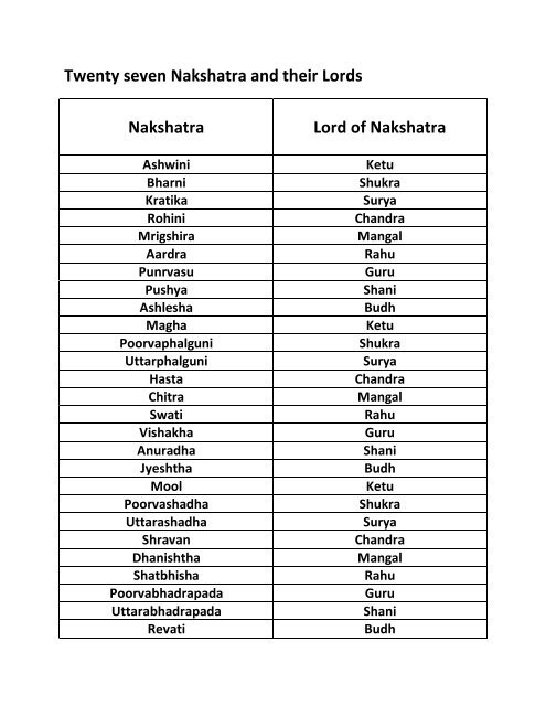 Name of 27 Nakshatras and Their Lords - Indian Astrology Sep 10, 2020 ... Each of the nakshatras is governed as 'lord' by one of the nine graha in the following sequence: Ketu (South Lunar Node), Shukra (Venus), Surya ...