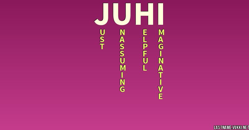 Urban Dictionary: Juhi Most Juhi's have black hair, brown eyes and are of South/ North Indian descend. And most importantly Juhi is secret savage eating for her moment to strike. She is the kind of girl who seems to be happy all the time, smiling and greeting everyone she meets, outgoing, but still reserved in some ways.