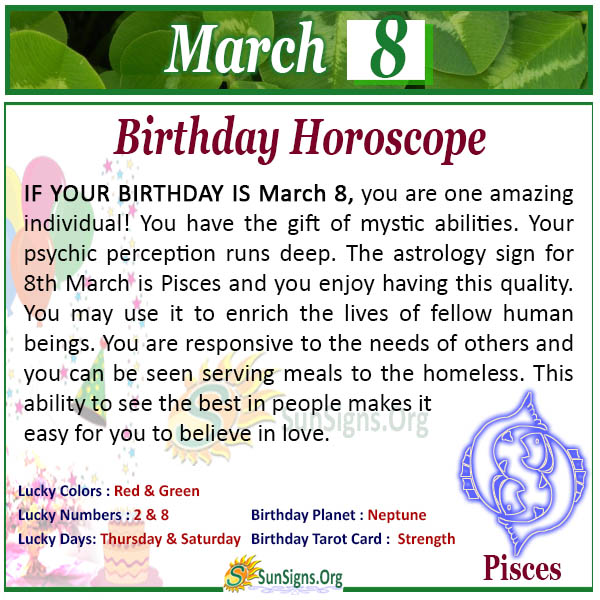 March 8 Birthday Horoscope — Zodiac Sign Personality Being a Pisces born on March 8th, you are well known for your intuition, sensitivity and self-sacrificing nature. Your intuition helps to guide you through all aspects of life, but especially social situations. While others struggle to pick up on emotional cues, your ability to read a person's feelings can be considered nearly psychic.